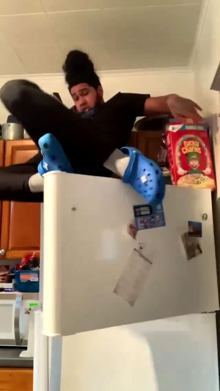 A man pretends to be Spider-Man as he squats on his refrigerator in the kitchen. The freezer door opens and he falls off.