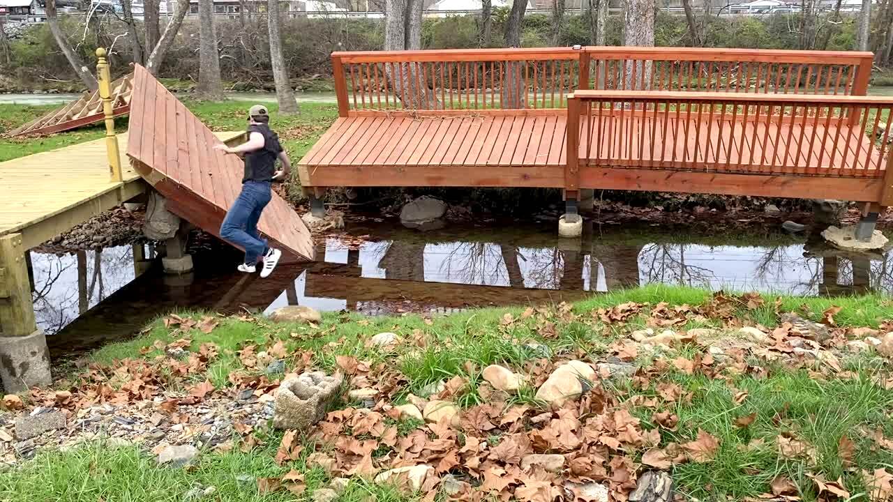 A teen boy tries to run and jump onto a broken bridge over a stream, but he slips and falls in the water.