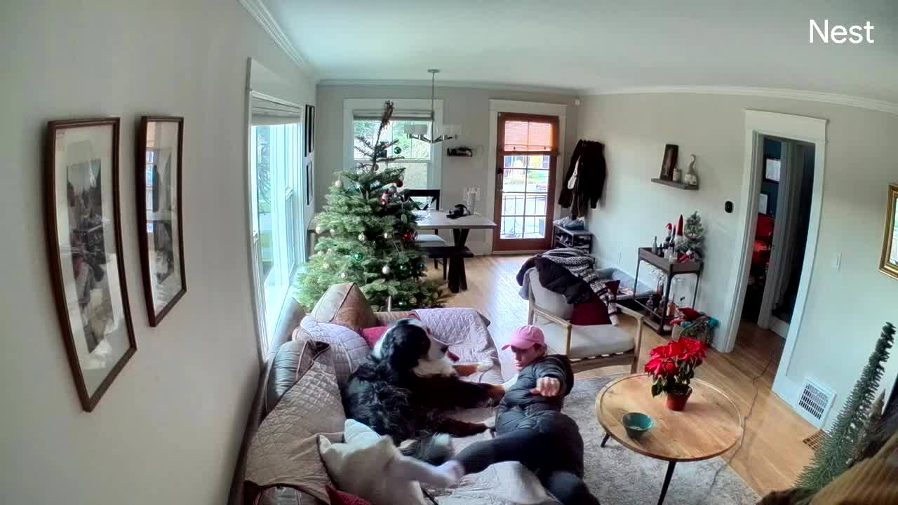 A woman tries to snuggle with her dog on a living room couch, when it paws and pushes her off and she falls to the floor. Security footage.