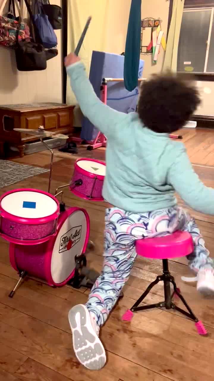 A young girl laughs while she plays with a toy drum set in the living room. She falls off her stool and onto the drumkit. She gets up and says "ouch."