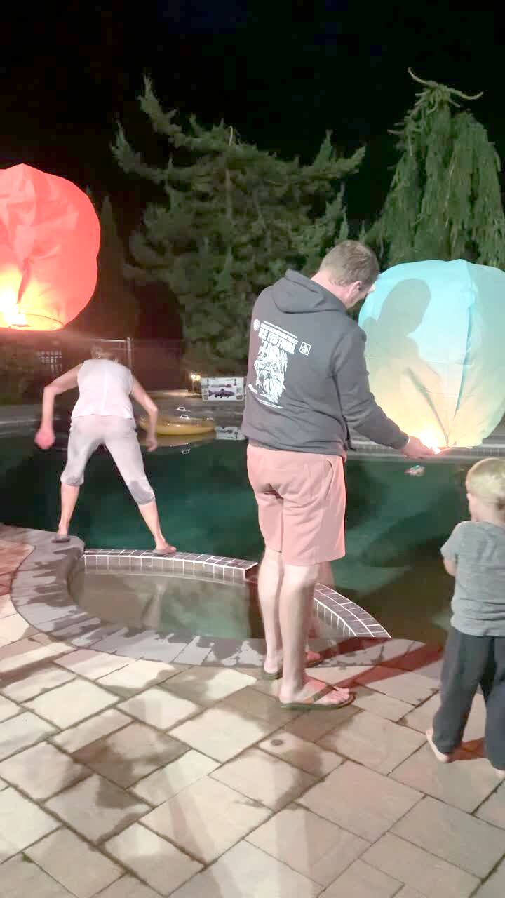 A family on the poolside throws paper lanterns into the sky but one falls into the pool. A woman tries to get it but she falls in the water.