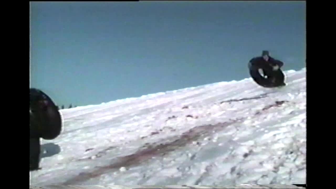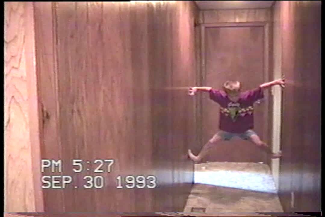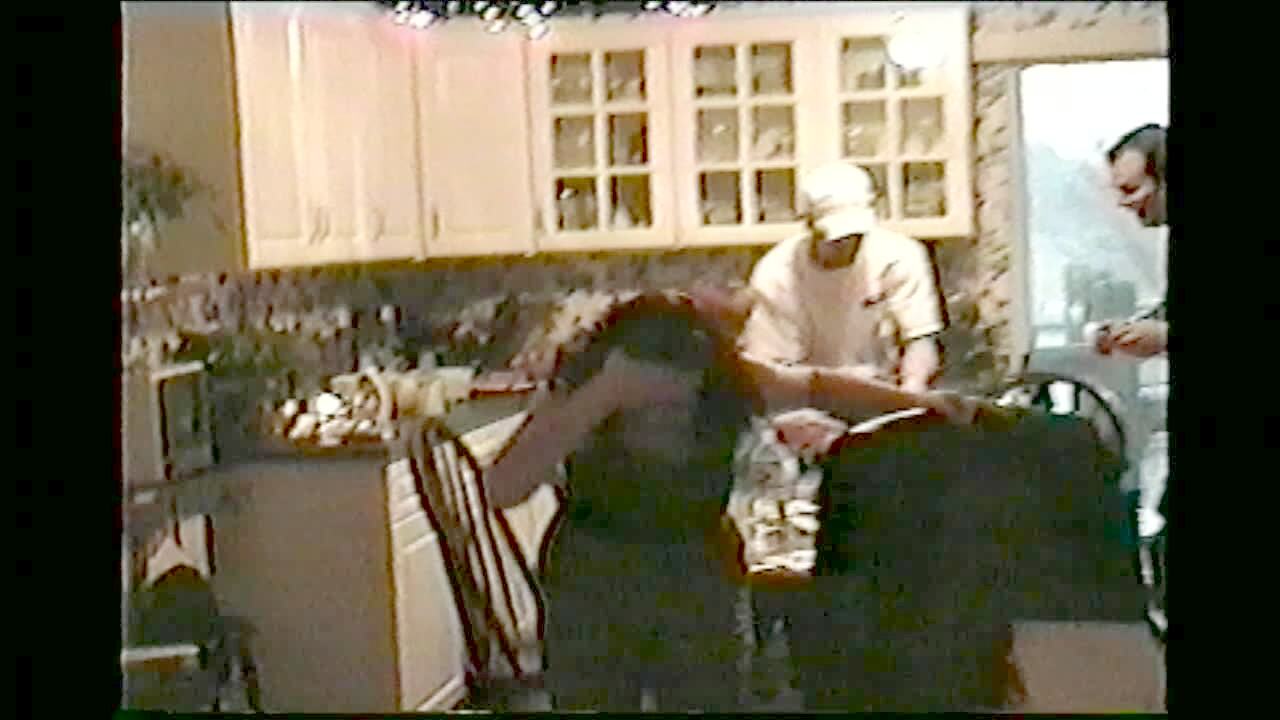 A man steps onto an icy front yard, then his legs repeatedly slip on the ice until he climbs back onto the porch. Security camera footage.
