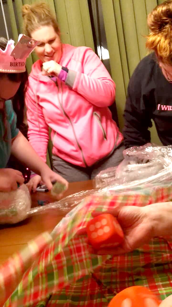 A family tries to do a trick where they flip whipped cream from their hands to their mouths. A woman tries to do this and the cream lands on the ceiling.