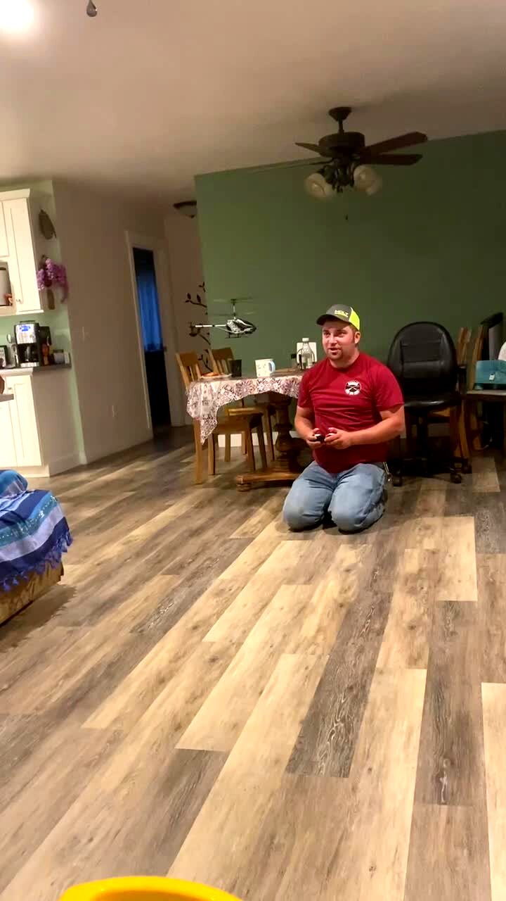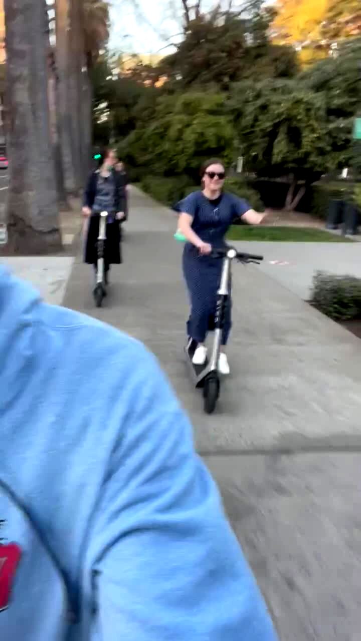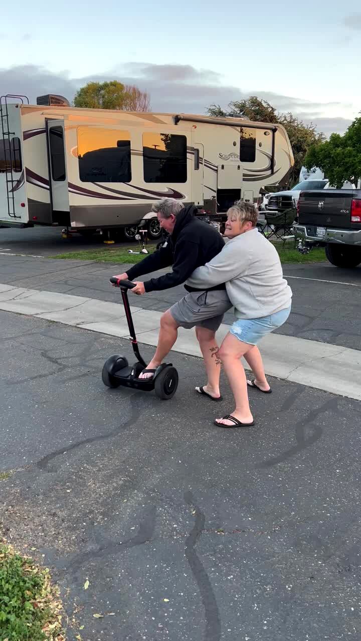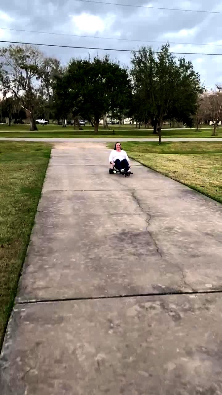 A woman on a hoverboard drives around a room and then falls and hits the kitchen counter.