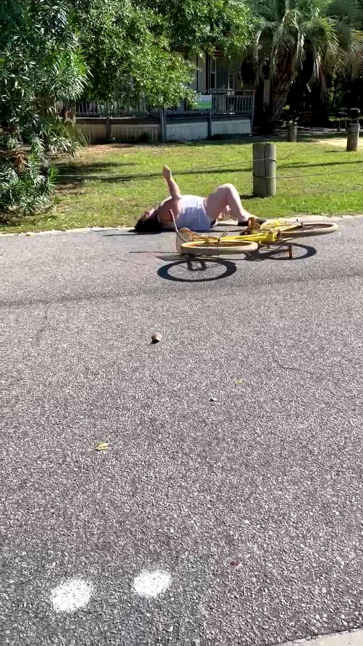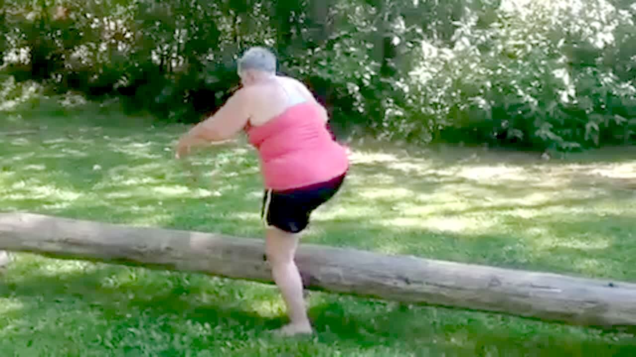 A senior woman pretends to be a gymnast and uses a log as a balance beam. She falls off the log a couple times, but falls to the ground when she jumps and spins to dismount the log.