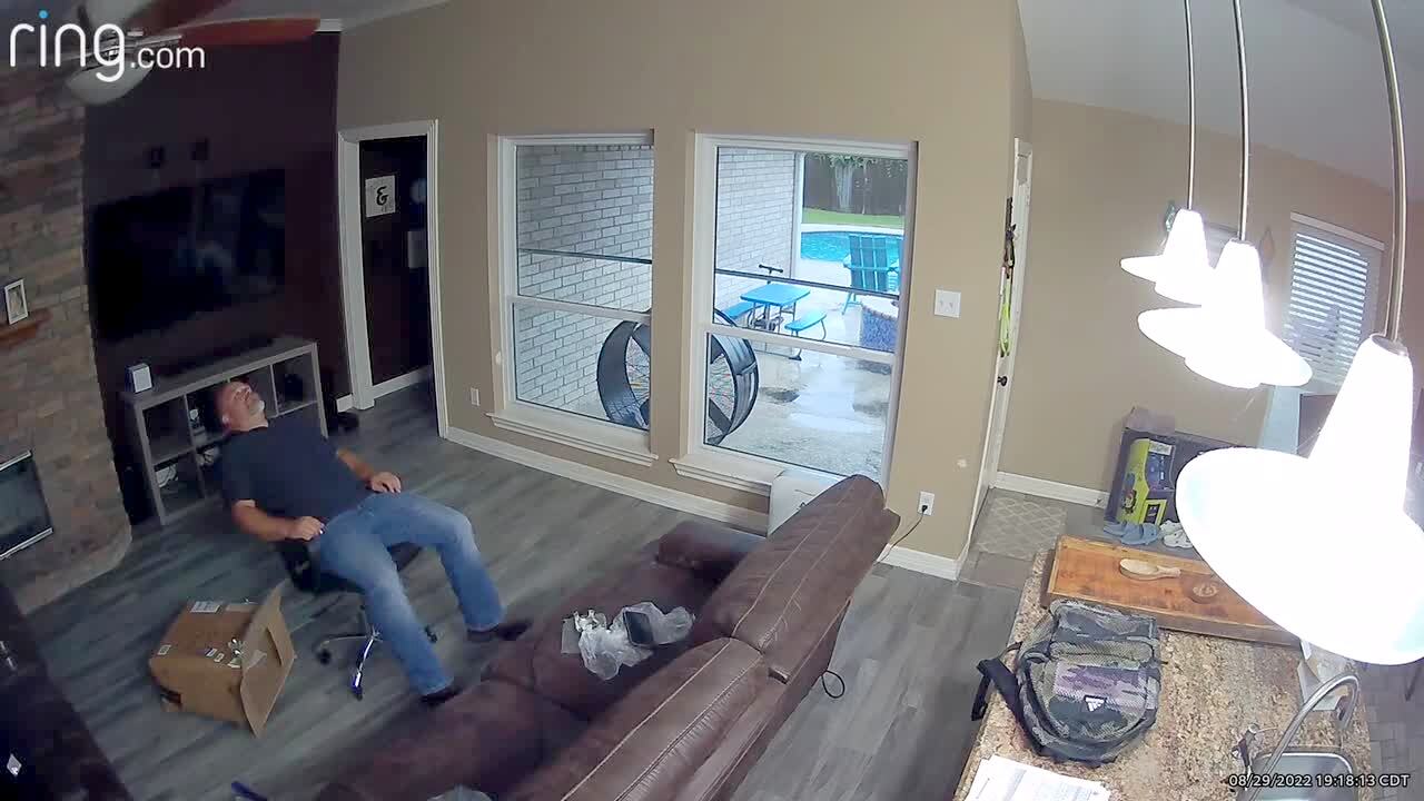 Sleet falls outside the house and it pours off the roof onto the ground. A man stands under the stream of sleet and laughs.