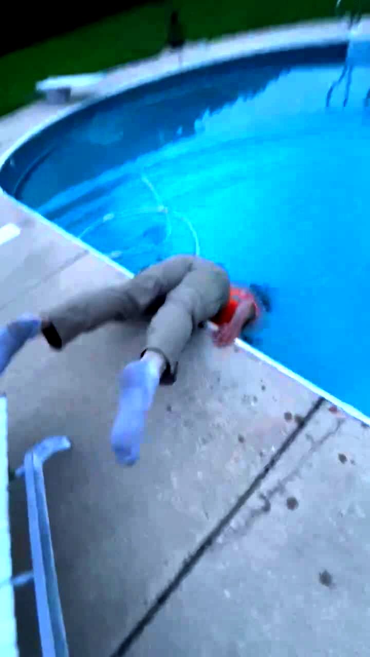 A man jumps on a diving board at a pool, but slips and falls head-first into the water. Featured talent cleared (the man on the diving board).