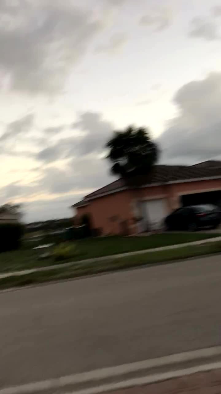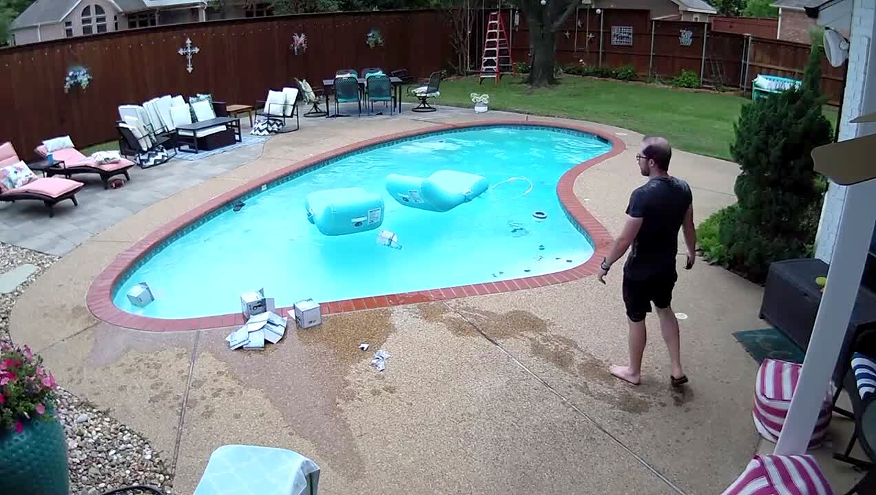 As a woman walks up the driveway and gossips about a man, a young girl sprays her in the back with a hose. She yells at her to stop. Security Footage. Featured talent cleared (woman and child).
