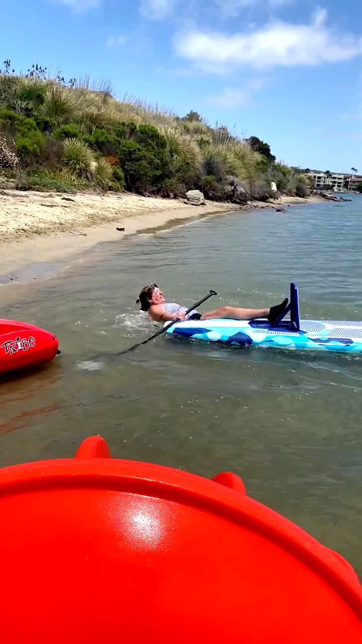 A woman stands on a paddle board on a lake and paddles backwards. The board hits something and she falls into the water.