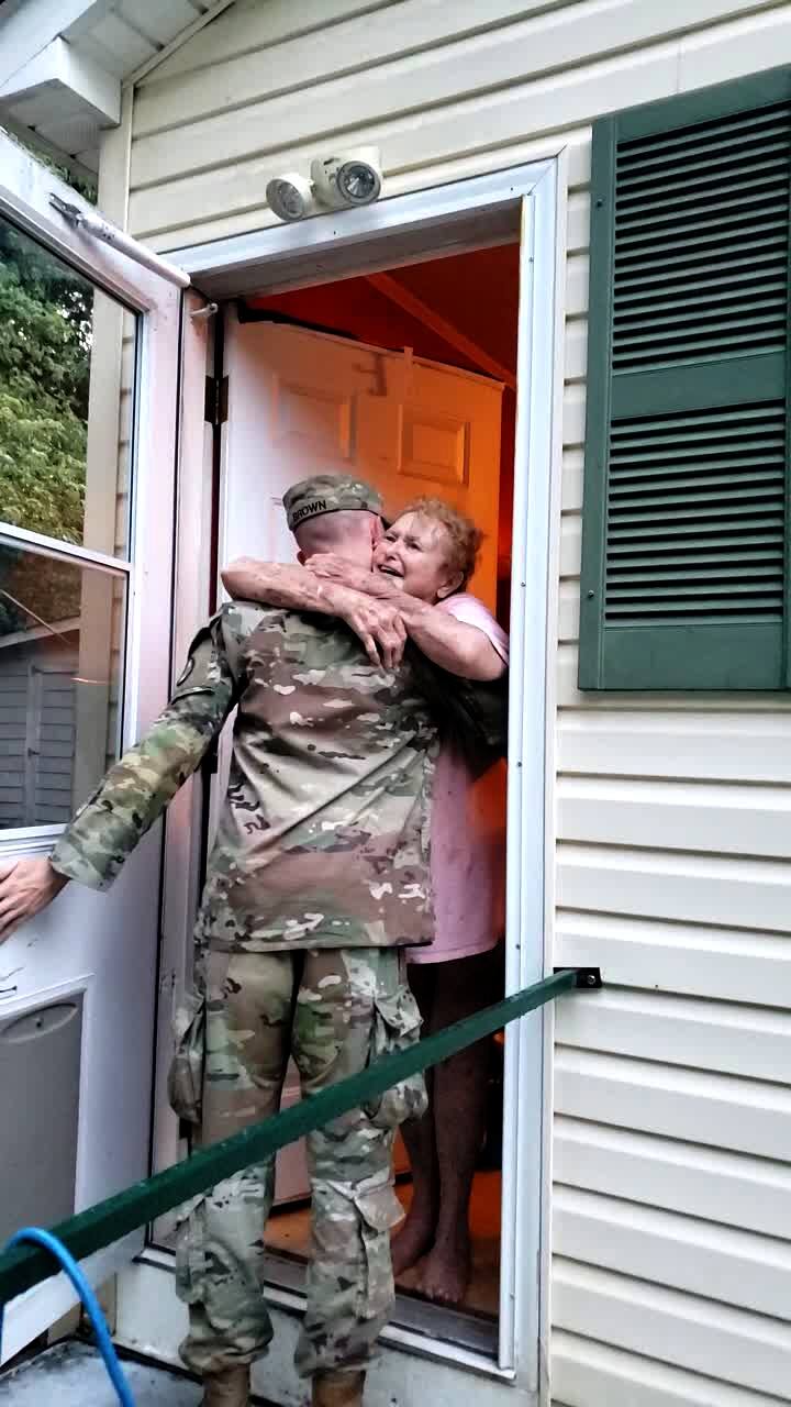 A senior woman opens a door and freaks out, exclaiming "you made me pee all over myself" when she sees her grandson home from the military.