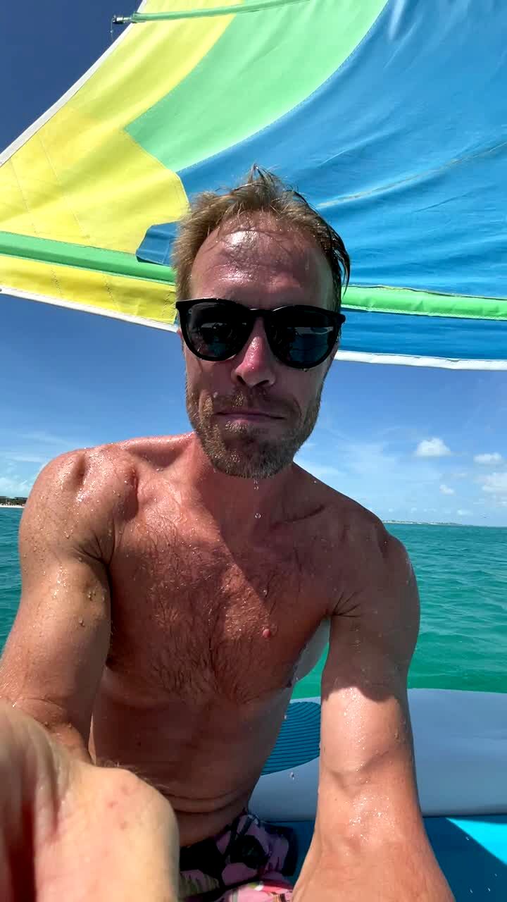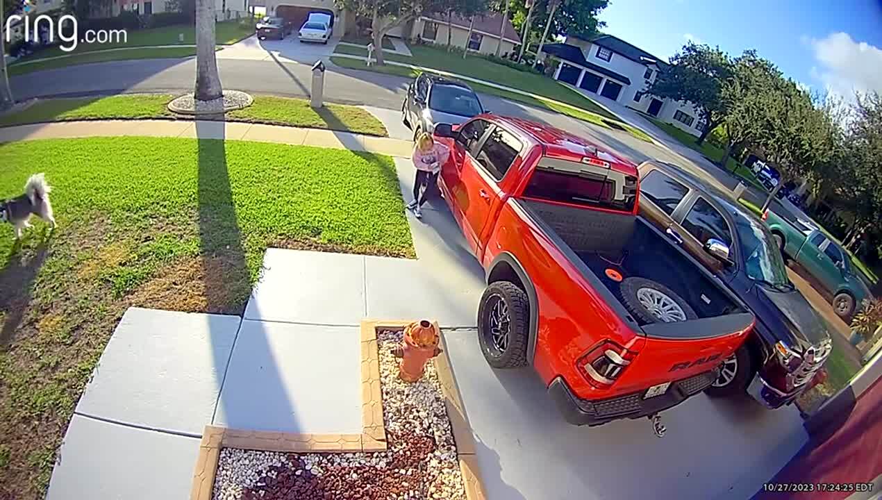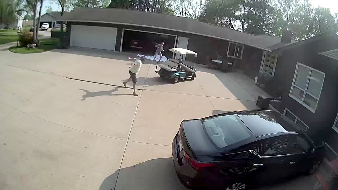 A man takes a tablecloth out of a golf cart on a driveway, which knocks a table onto the gas pedal. The cart drives in a circle by itself while the man runs after it. Security footage.