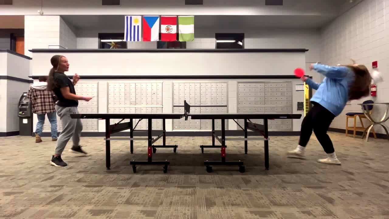 Two young women play table tennis in the college student center. One of them accidentally spikes the ball into her friend's face who dramatically falls down. Featured talent cleared only (the two women playing ping pong).