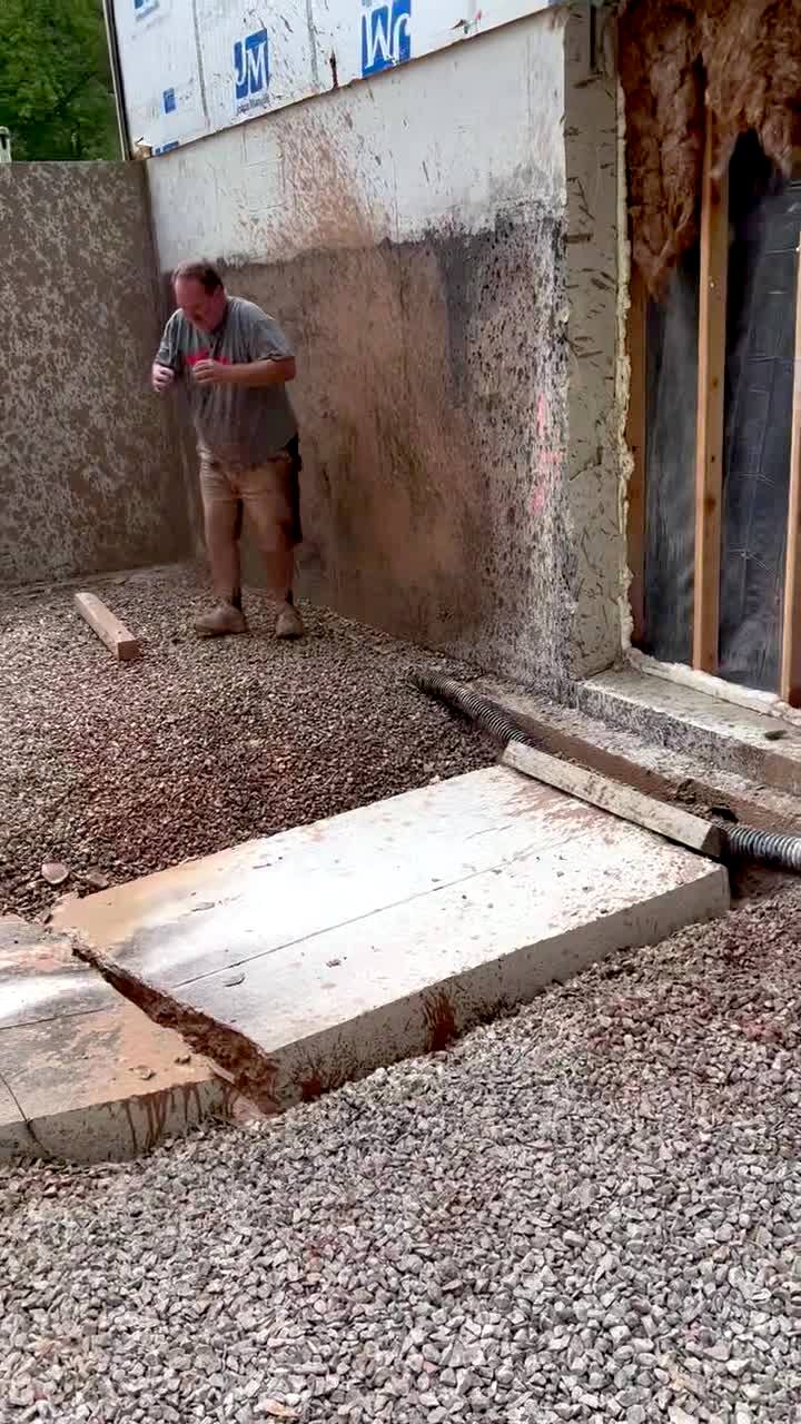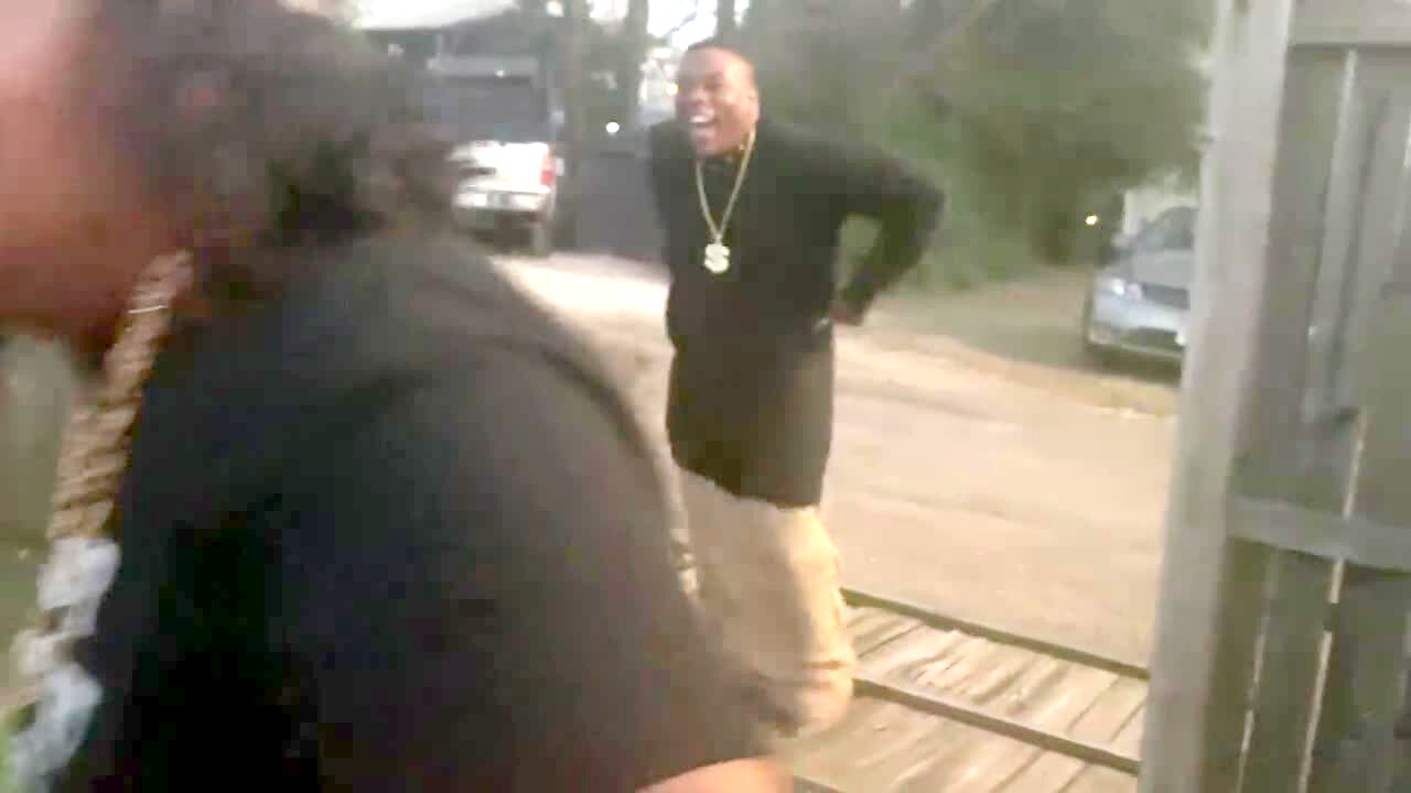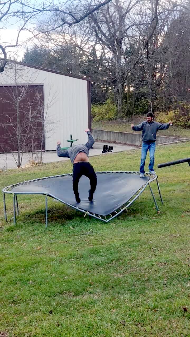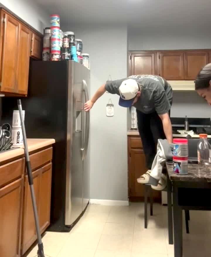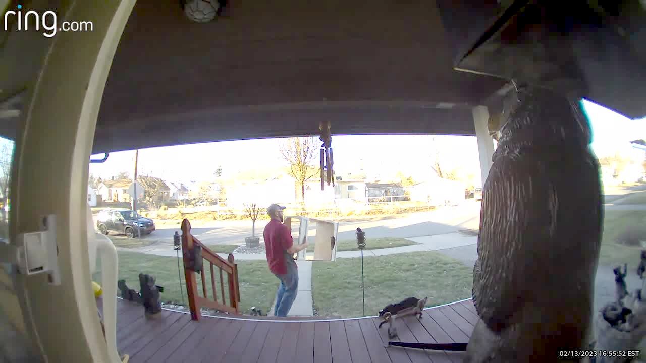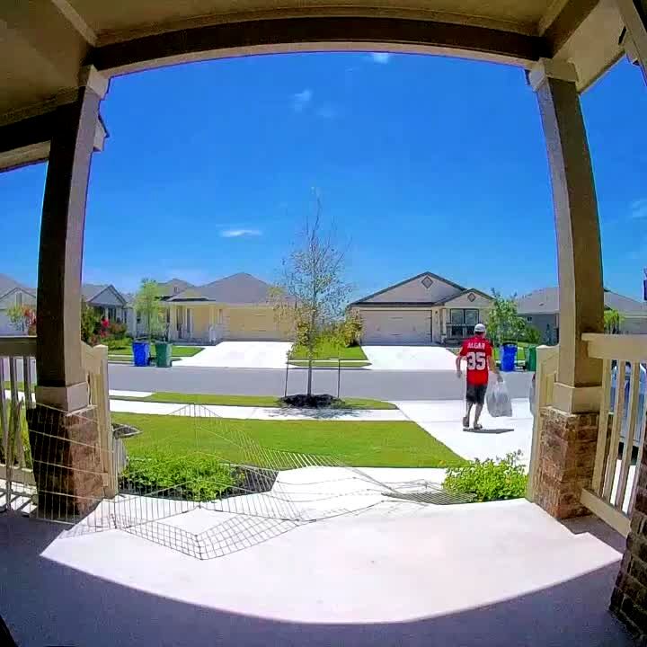 A young man walks out onto the front porch outside to take out the trash. He trips on a gate and falls. Security Footage.