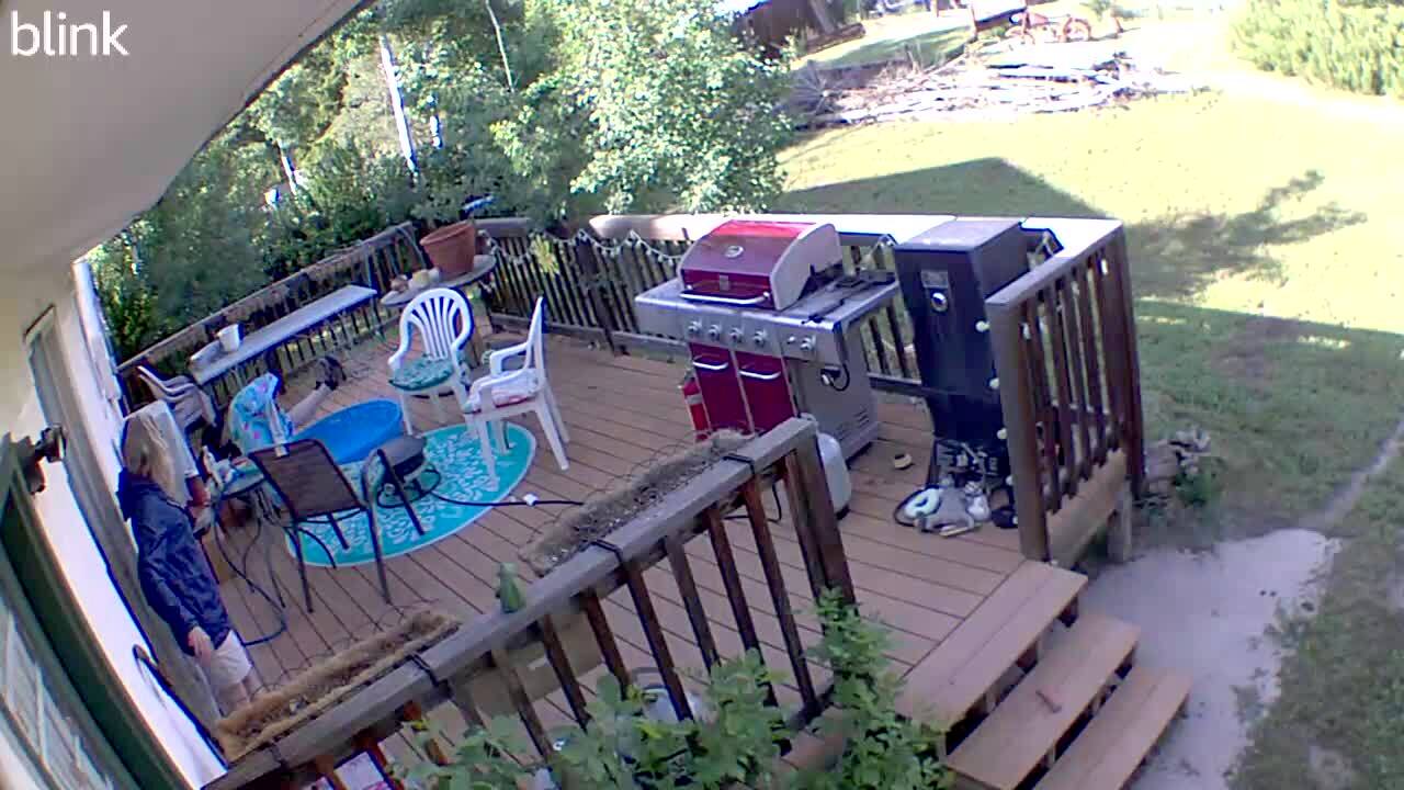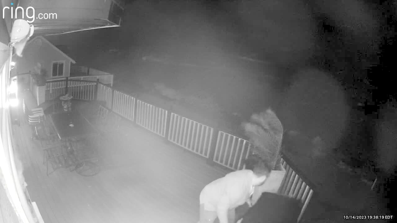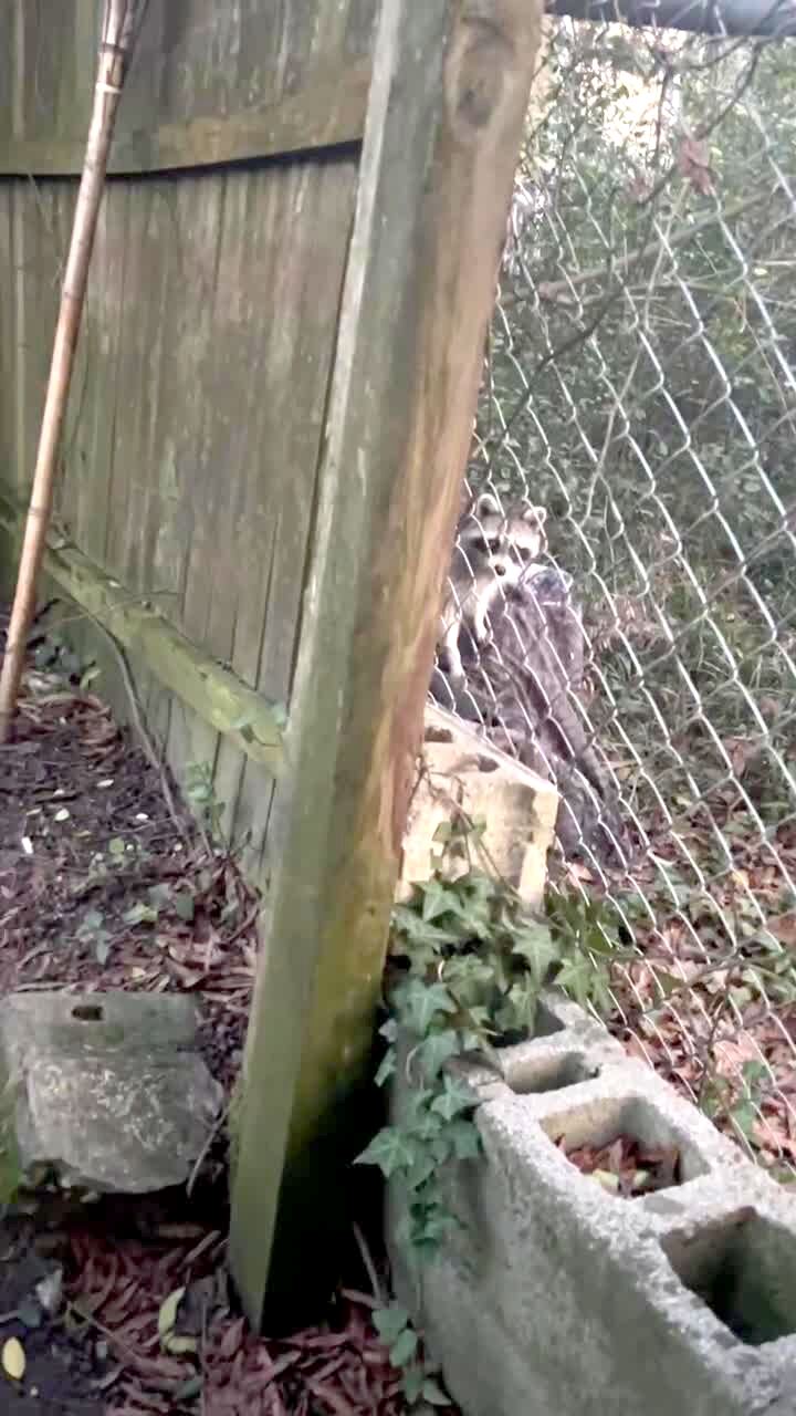 A man in his backyard proposes to his girlfriend. Meanwhile, the woman who holds the camera gets distracted by a raccoon and misses the actual proposal.