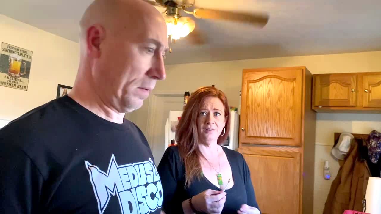A man plays a practical joke on his wife, telling her that there's a bat is in the bathroom while she takes a shower. He throws a sock behind the shower curtain, and she screams.