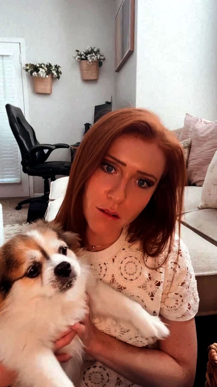 While it's tongue hangs out, a dog repeats, "Lala," with a woman as they sit on a living room couch.