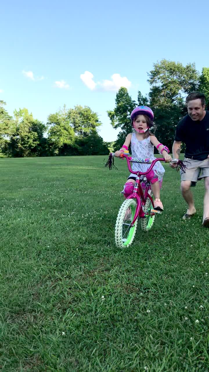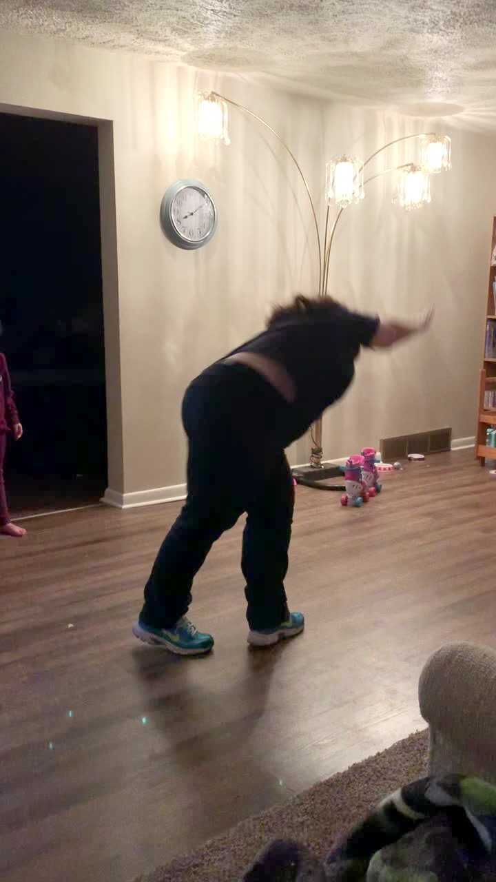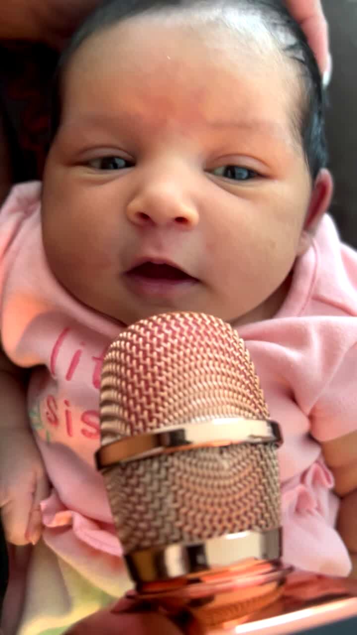 A baby girl in the living room hiccups into a microphone and the hiccup echoes. A man laughs at the daughter.