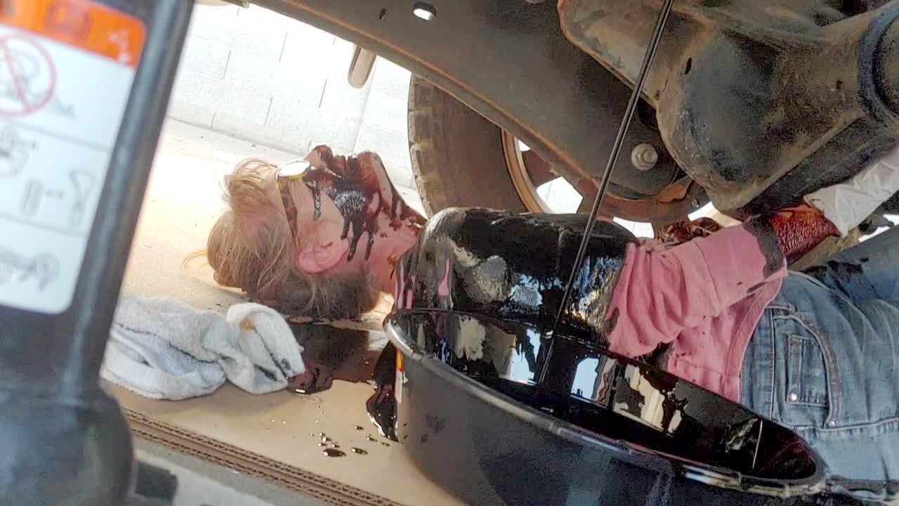 "Oil Change Calamity." A senior woman performs an oil change on a car in a driveway. She spills oil on her shirt, then moves a tray and gets oil all over her face as she asks her ex-husband for a rag.