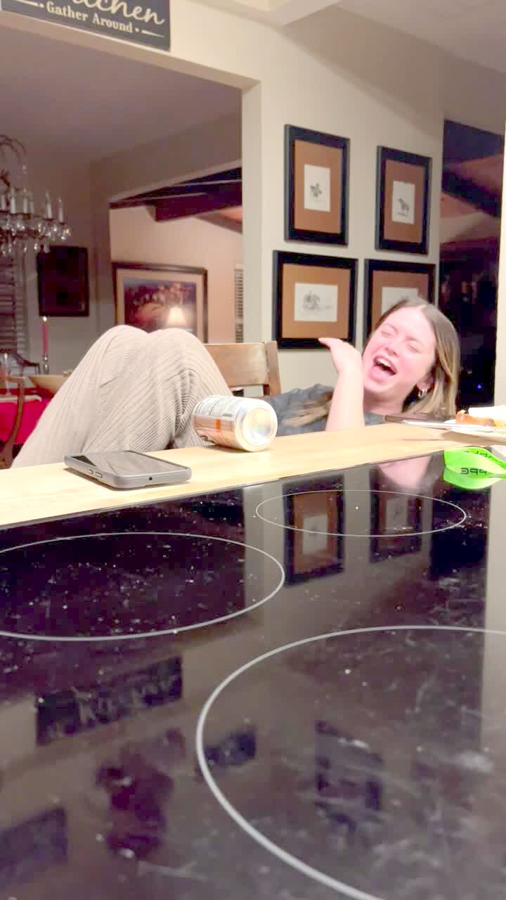 A woman sets an unopened soda can on the kitchen table and says she will smash it. She brings her head down on it and hurts her head on the can.