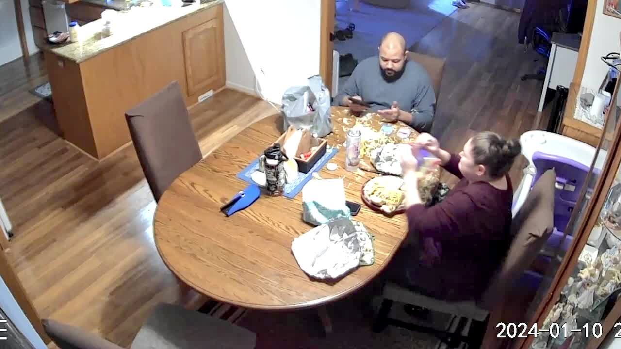 A woman attempts to open a bag of salad when it breaks and lettuce flies everywhere in kitchen. Security footage.