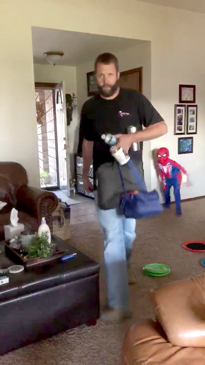 A young boy in a Spiderman costume stands behind a wall. A man enters the room. The boy tries to scare the man but the man turns around and moves the other way before he can scare him.