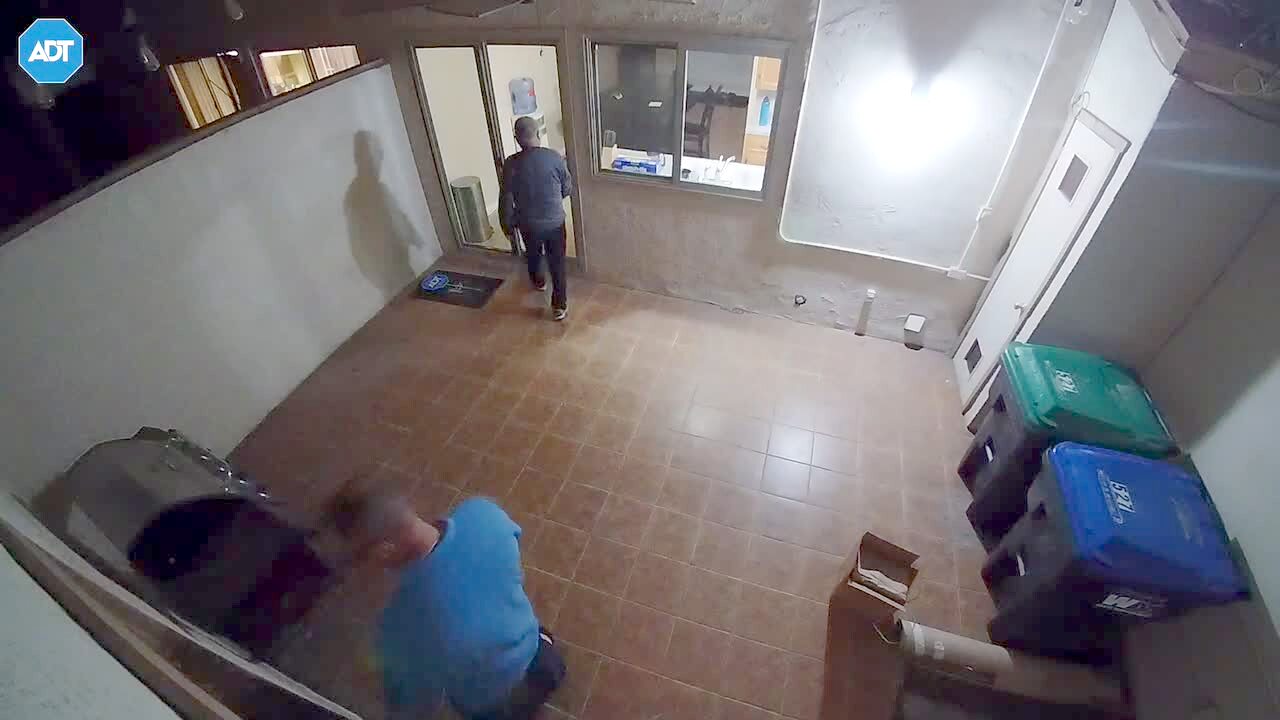 A man walks straight into a glass door in a yard. Security footage.