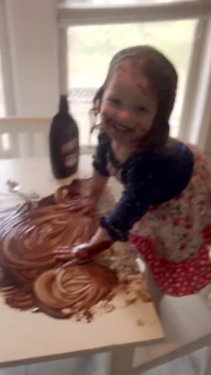 A young girl smears chocolate sauce all over herself and the kitchen table as her mother gasps.