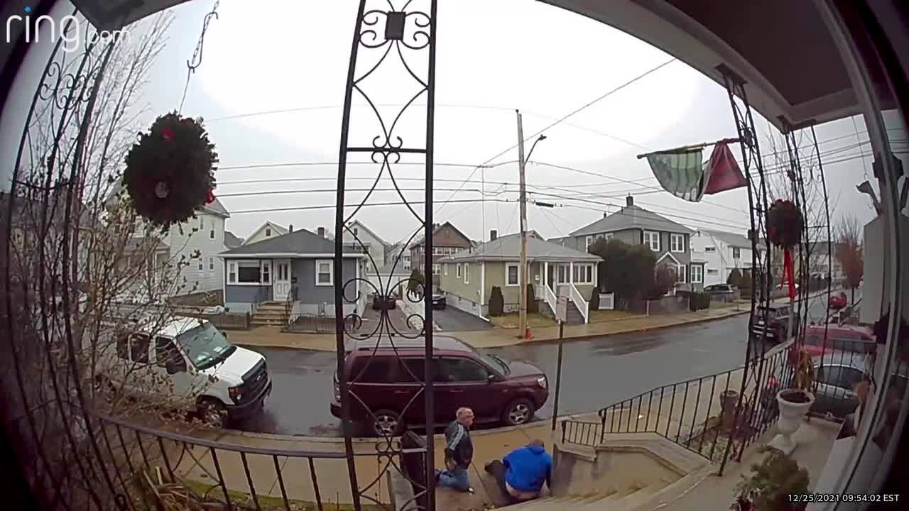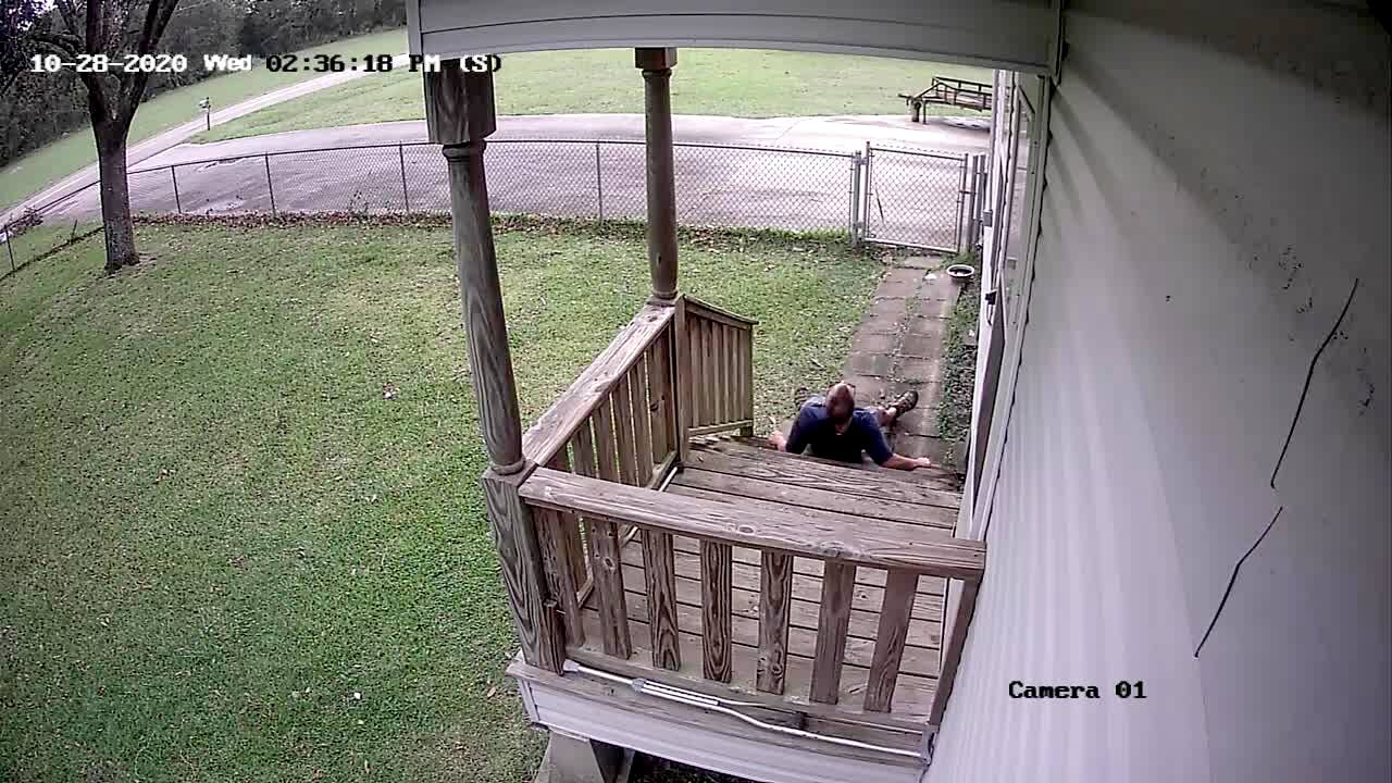 A man trips on a porch step and falls on his backside. Security footage.