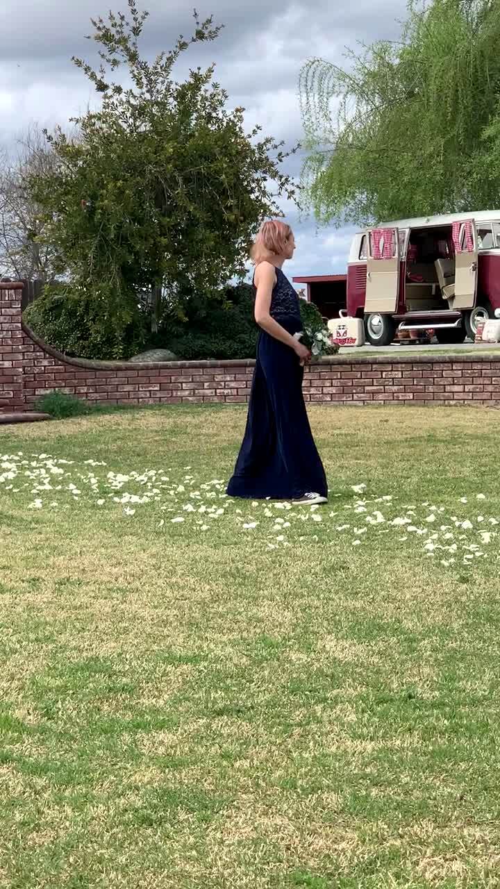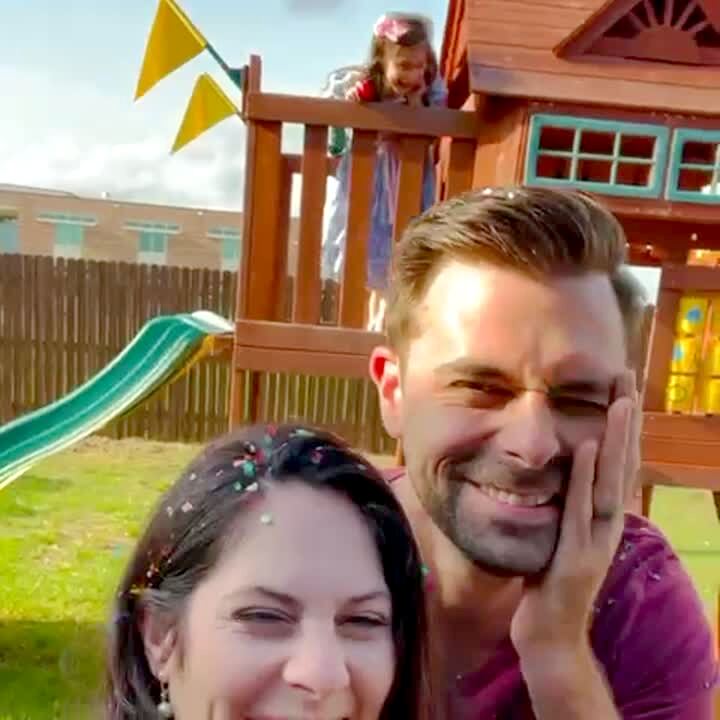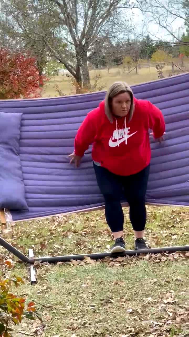 A woman tries to do a flip over her husband to show her friends, but he moves at the last minute and she falls on her face.