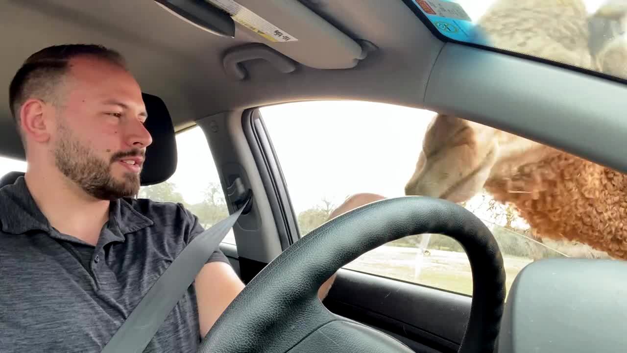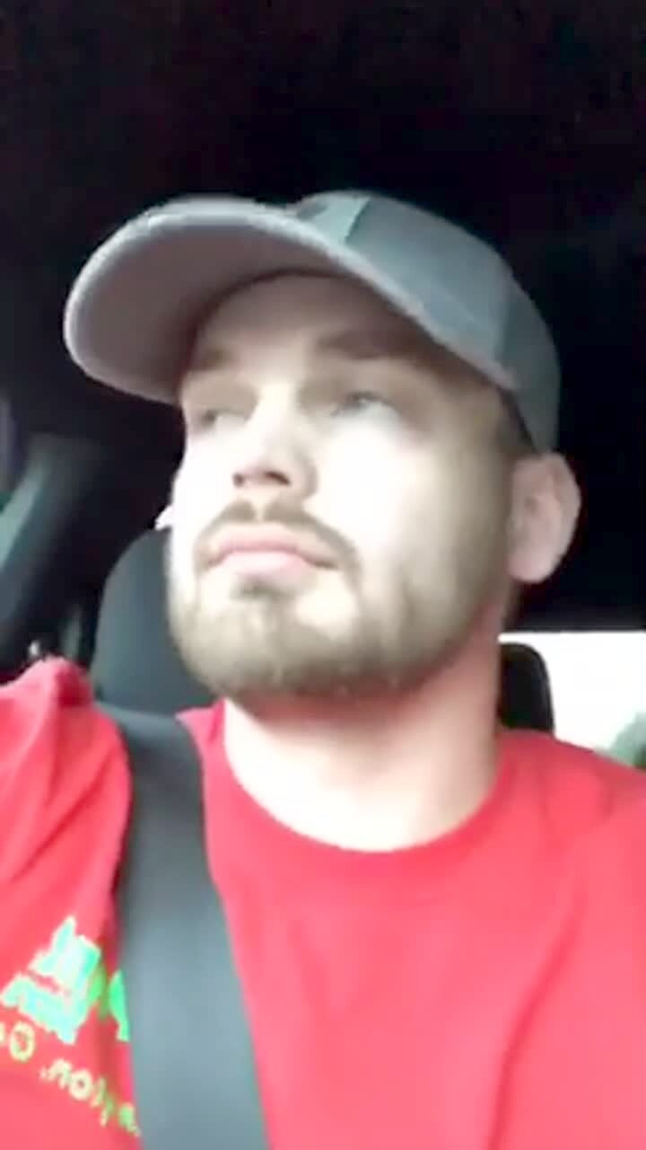 A man films himself in his car as he listens to "Old Town Road" on the radio. He reveals a horse in the back of his truck. Music rights not cleared.