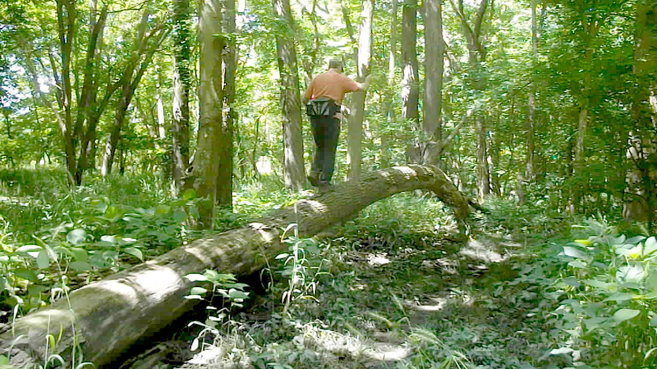 A young girl walks across a log in a forest and celebrates prematurely after making it across then slips and falls as she tries to jump off.