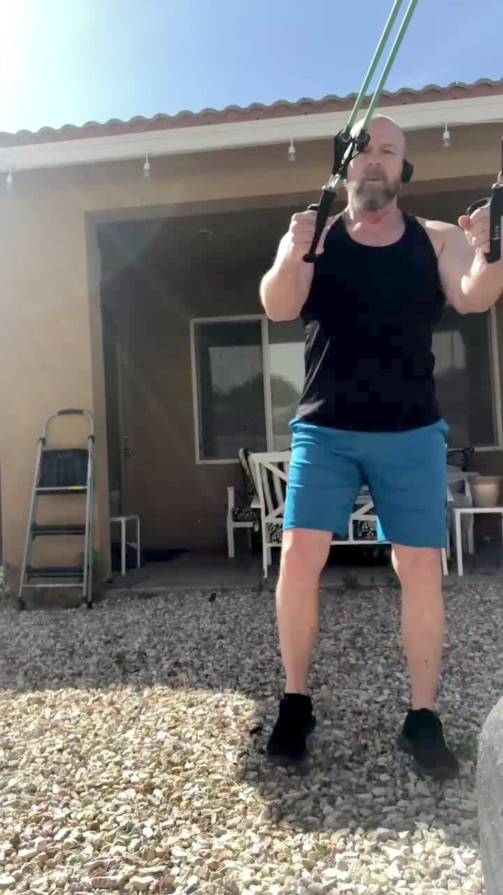 A man hits himself in the chest with an elastic band when he does a workout in the yard.