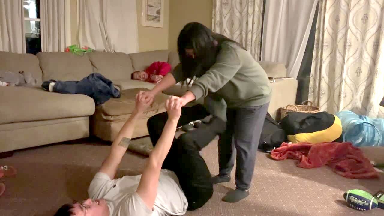 A man lifts a woman up with his legs, and she flips then falls off when she tries to balance as "My Heart Will Go On" plays in the living room. Music rights not cleared.