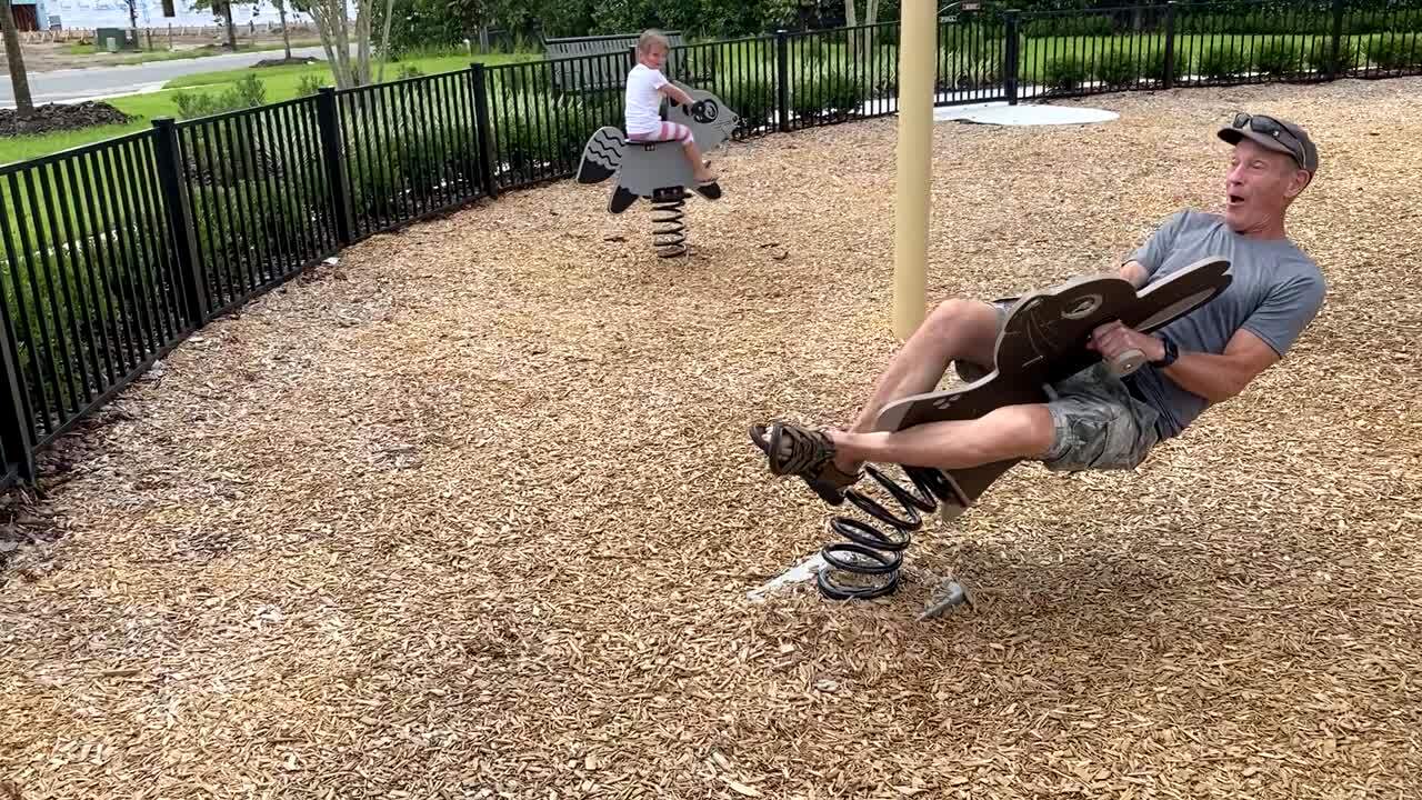 A senior man sits down on a spring rider and leans heavily to one side, then he falls out of it in a park.