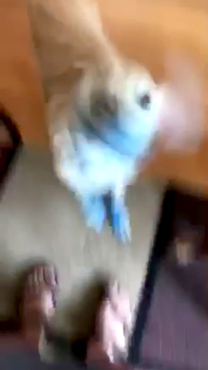A woman asks her dog if she is responsible for a destroyed blue pen, and then she looks at her other dog whose face and paws are blue.