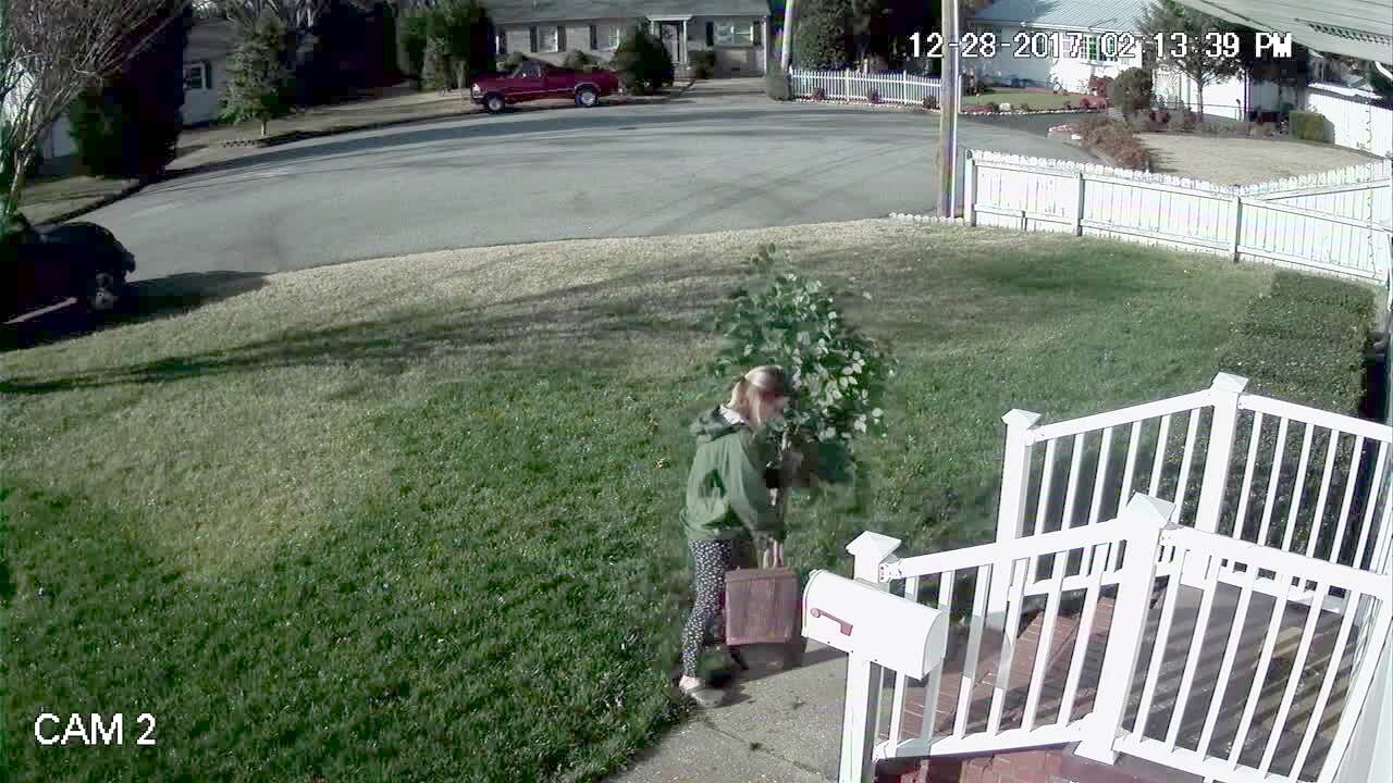 Three deer run up the driveway, then break a window in the garage while a man watches. Security footage.
