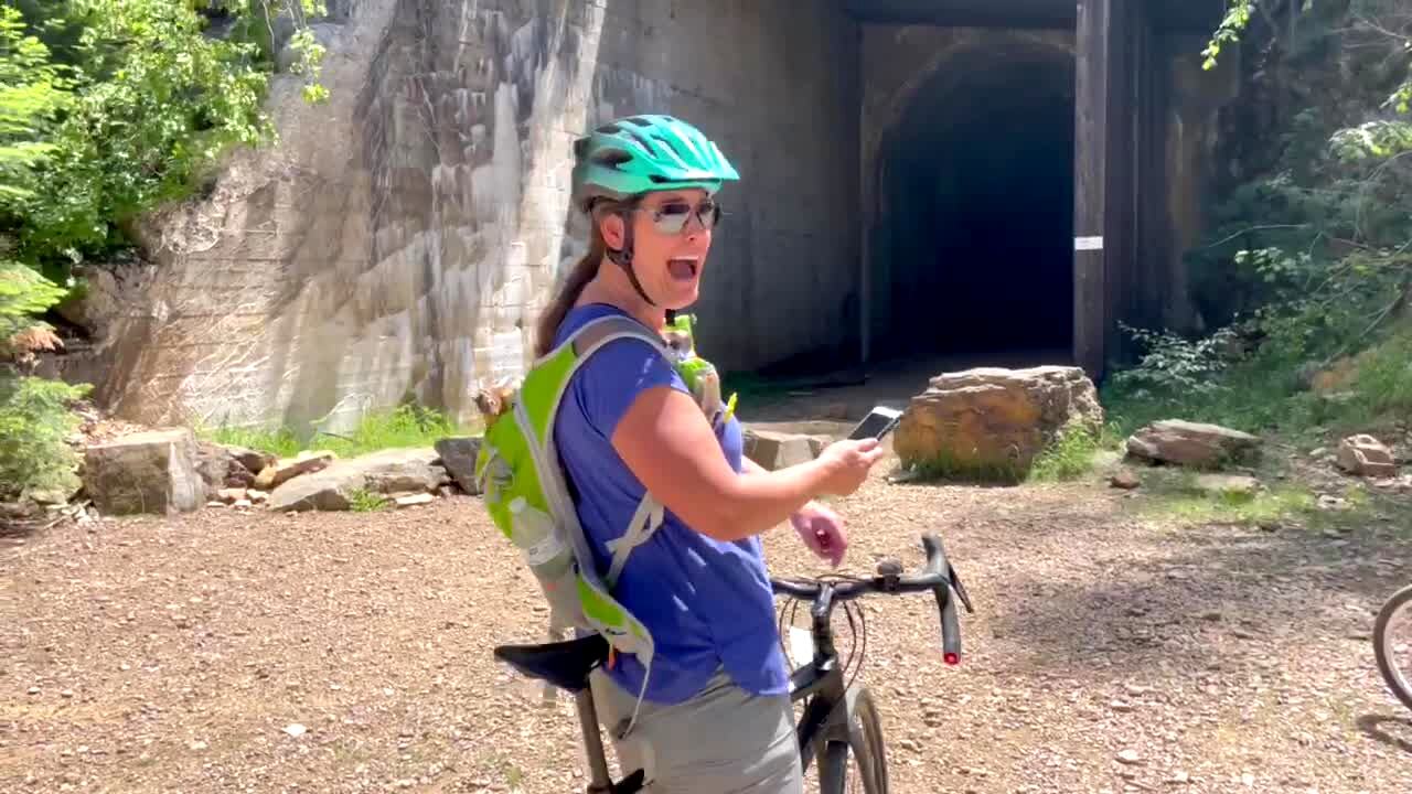 A chipmunk jumps onto a woman's backpack in the woods, and she screams, then it climbs onto her shoulder before jumping to the ground.