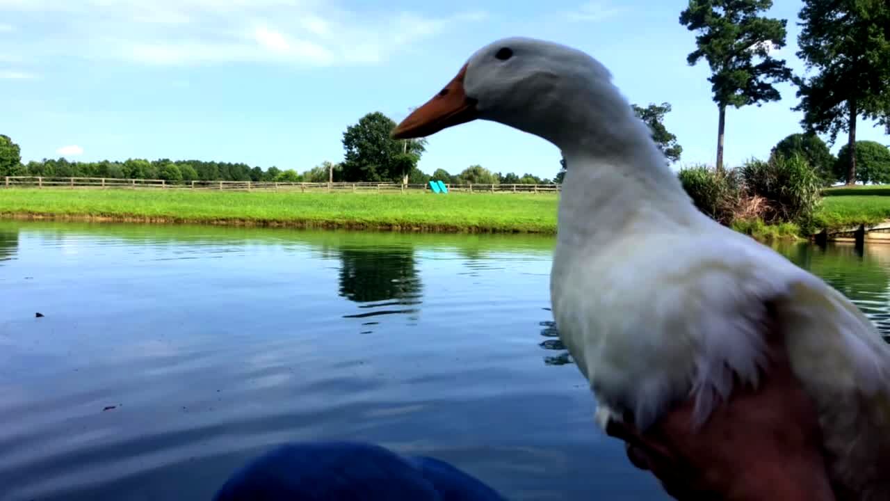 A man paddles in a paddle boat on a pond while holding a duck. He sets the duck in the water. The duck does not want to be in the water and struggles to get free. As soon as the man lets go of the duck, the duck quickly flaps its wings to the shore.