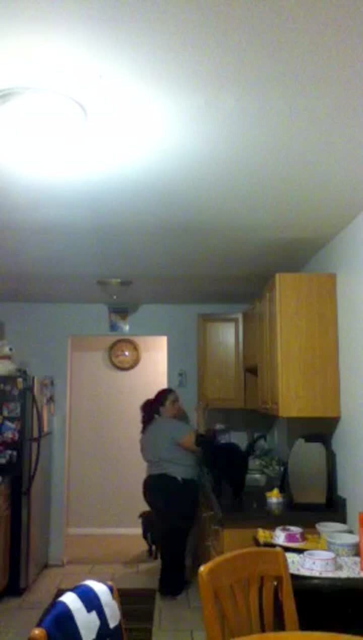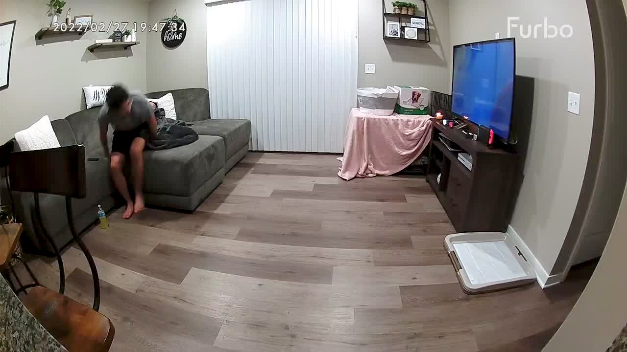 A large pig runs around the living room with a chair stuck on its back. A man runs in and removes the chair from the pig's back. Security footage.