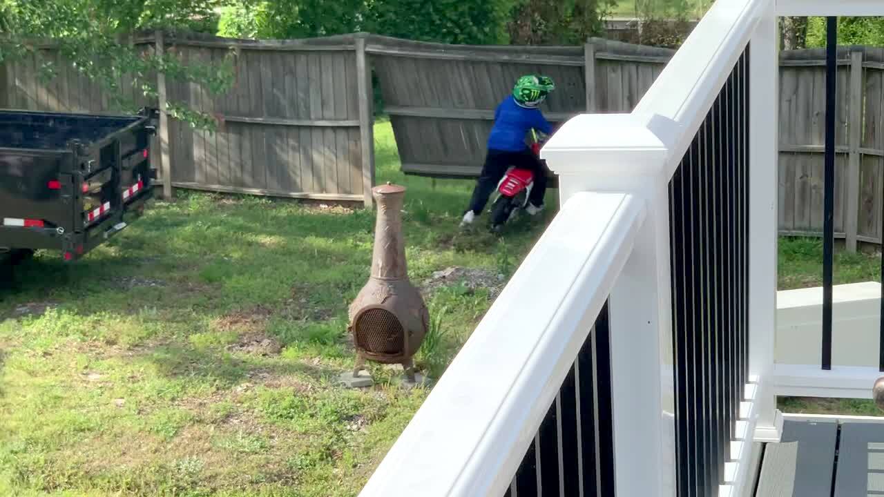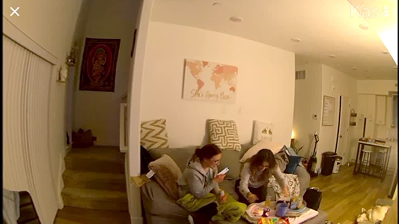 A teen girl gets off of her four wheeler vehicle and runs into the garage, then she screams when a horse runs across the driveway. Security footage.