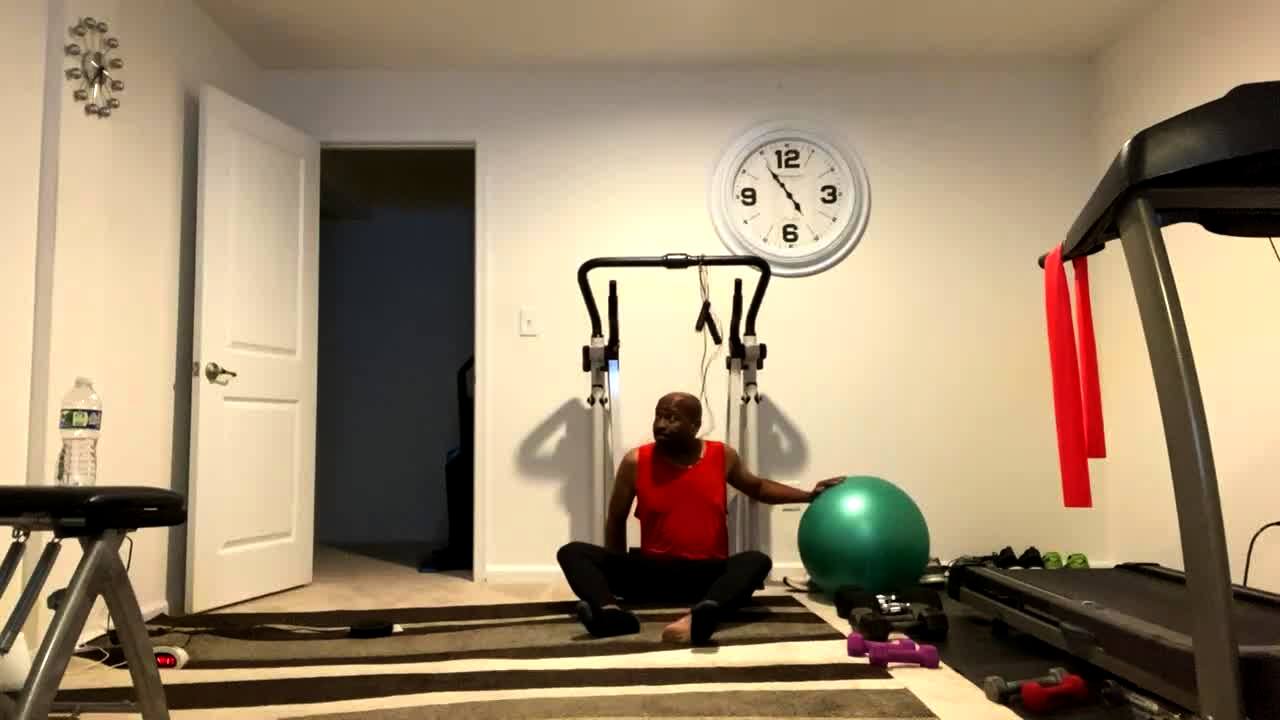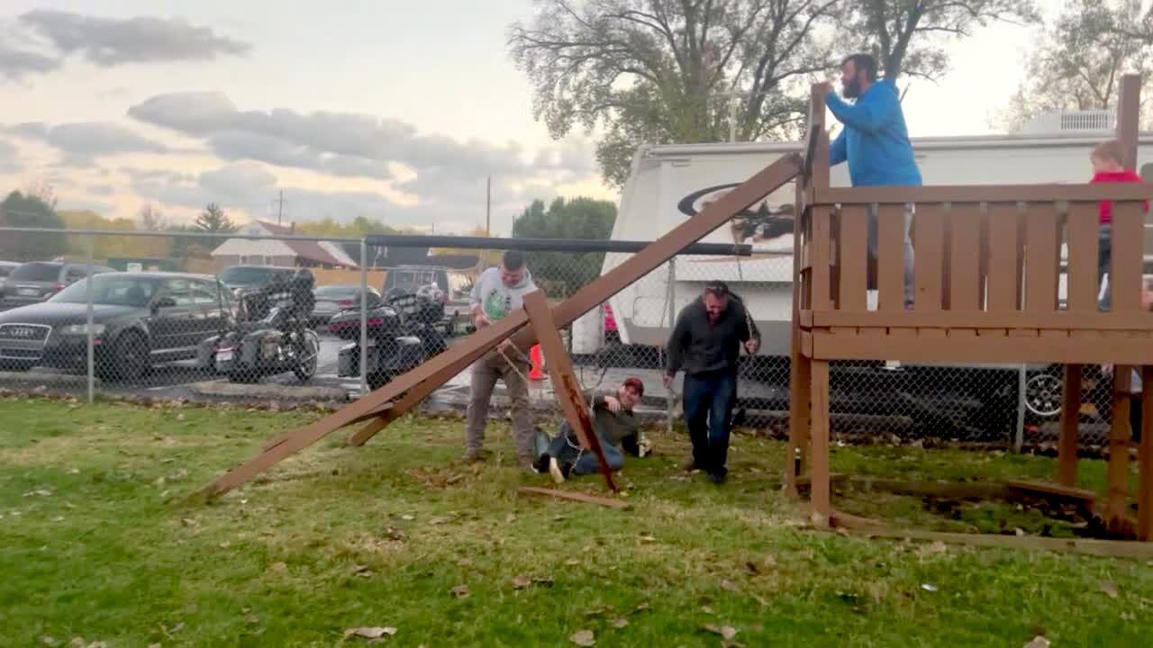 A man tries to remove a bird's nest from the rafters of his porch. A bird flies out of the nest and the man is startles and falls off of the ladder onto the floor below. Security footage.