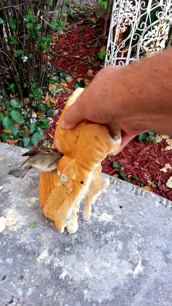 A bird flies at a family while they walk toward a house. A teen girl waves a fly swatter at the bird and it then flies toward a woman. She screams and shakes her sweater at it.