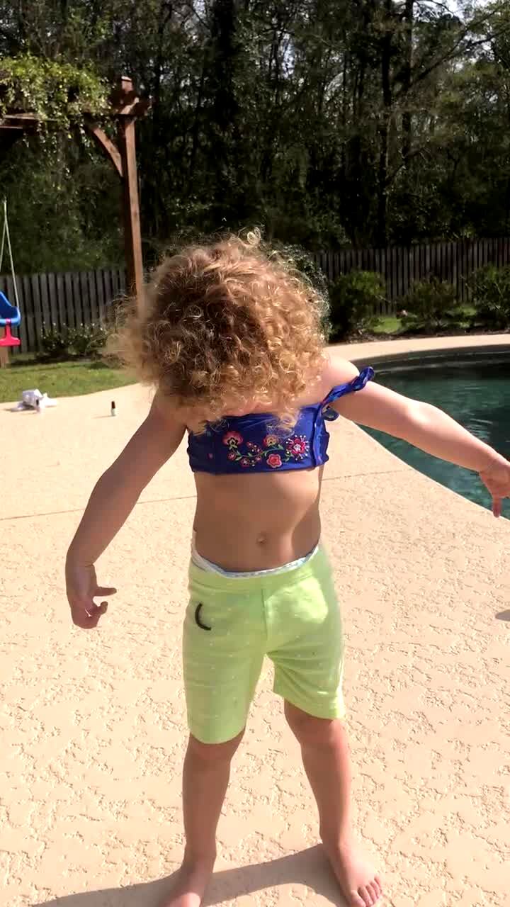 There is a tree frog on a woman's shoulder in a pool outside. There is a man behind her. The woman says, "On your mark, get set, go." As soon as she says "go", the frog jumps off her shoulder and onto the man's face.