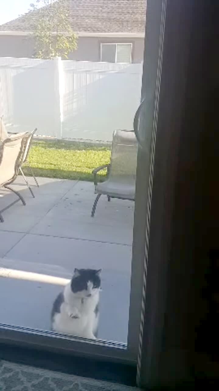 A man walks up to a front door on a phone call when he sees a duck flying towards him. He steps backwards and falls into a bush. Security footage.