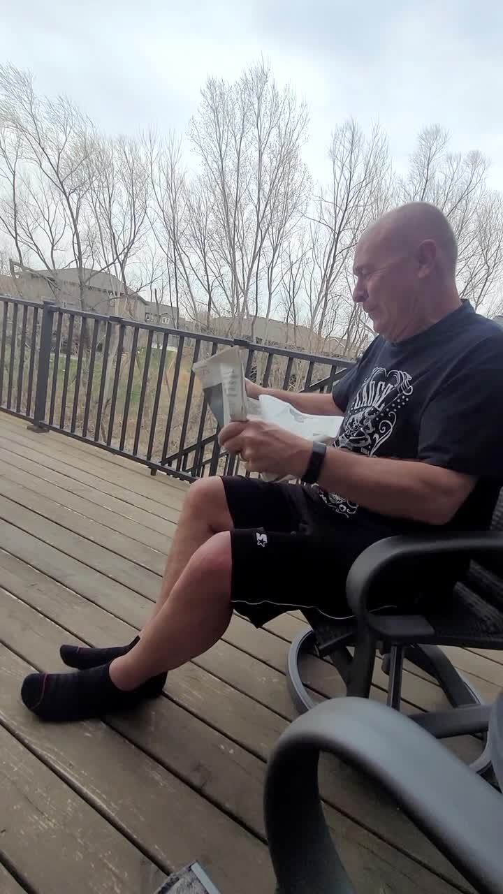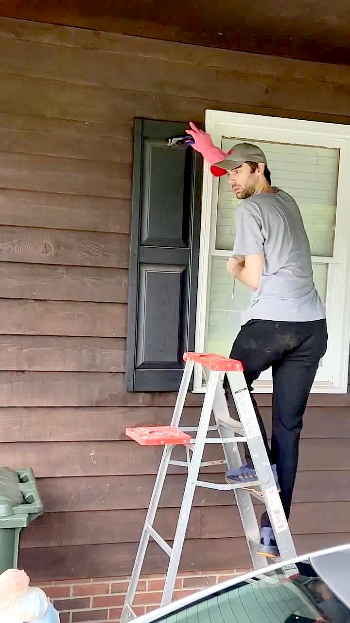 A teen boy takes down a hanging plant and a bird flies out of it. He screams on the front-porch and runs into the house. Security footage. Night. Dark