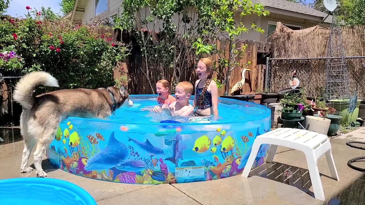 A potbelly pig walks onto the front porch of a house, then a tot girl and a tot boy walk out the front door and scream and run away. Security footage.