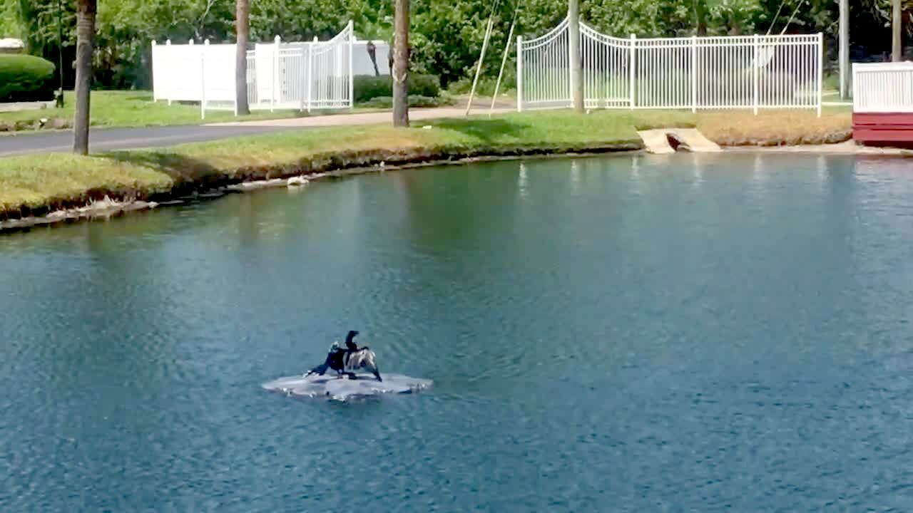 An inflatable Santa decoration flies out of a front yard and lands in a yard across the street. Security footage.
