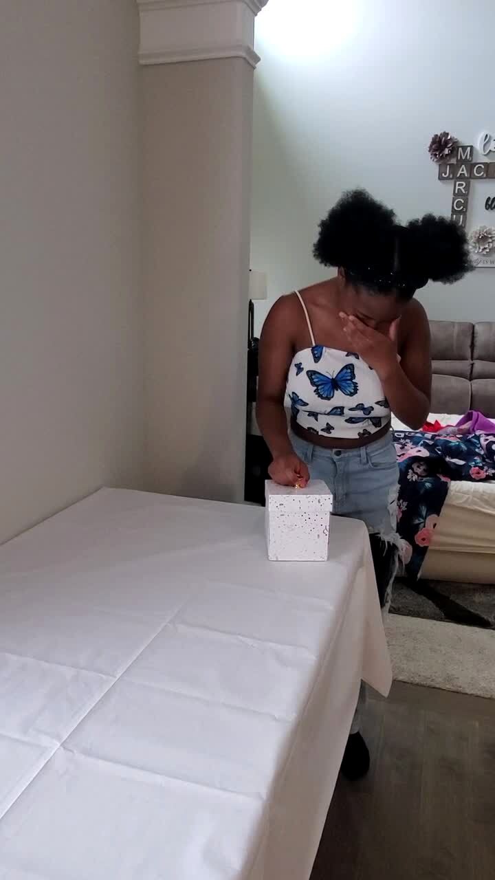 A young girl closes her eyes as her grandpa walks down the stairs behind her with a new dollhouse but he drops it and it breaks apart then the girl's mom tells her to keep her eyes closed.