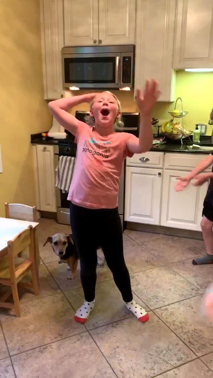 A tot girl pulls a bottle of ranch dressing out of her Christmas stocking. She lifts it up and says, "I got ranch!" She the proceeds to walk around the room and show it off.