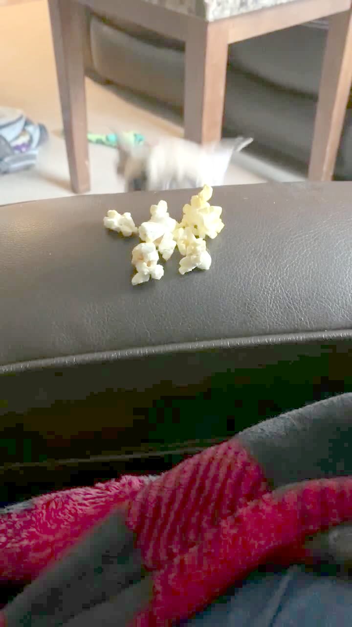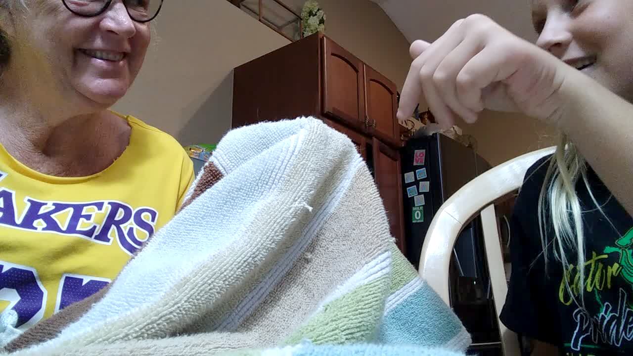 Two young girls open presents on Christmas morning. The man behind the camera then finds his third daughter inside a pantry, eating marshmallows from a bag and from the floor.